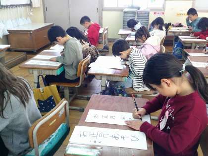 1年生は、書写の学習で書き初めに挑戦しました。フェルトペンを使って、「お正月あそび」と書きました。とめやはね、はらいに気を付けて書くことができました。