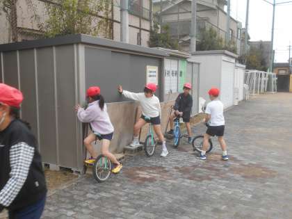最後に、竹馬や一輪車に挑戦しました。初めてする子も多く、苦戦しながらもがんばっていました。体育の学習を通して、いろいろなようぐの使い方に慣れていってほしいなと思います。