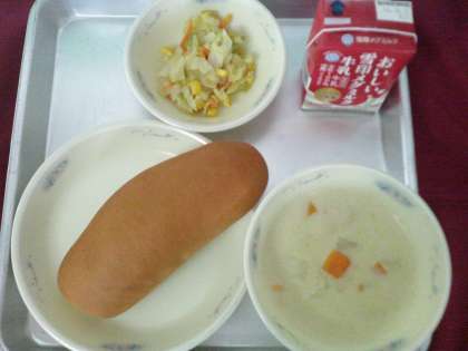 いつものクリームシチューは、牛乳から作られる脱脂粉乳を使っていますが、今日は豆乳を使っています。豆乳のまろやかなあま味を味わいました。
