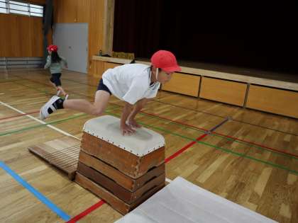 今日から体育ではとびばこあそびに入りました。久しぶりの体育だったので、念入りに準備運動をしました。ケガしないよう安全に気を付けて、グループで用具の準備もできました。手をどこについたら、跳び越せるかをよく考えていました。