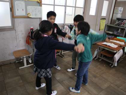 今日はわらべうたのひとつ「なべなべそこぬけ」を楽しみました。少人数でやるとうまくいくのに、人数が増えると難しい…。「どうやったらうまくいくの?」「ぼくたちの間をくぐり抜けてみてよ!」などコミュニケーションをとりながらやってみました。クラスの輪でもやってみて、成功することができました。室内でも楽しめるわらべうた、天気の悪いときなど、教室で楽しんでほしいと思います。