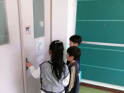 まず、1、2年生のグループになって、学校探検をしました。2年生が一生懸命、教室の説明をしてくれました。1年生は、2年生となかよく手をつないで、いろいろな教室の場所や役割を知ることができました。校長室にも入ることができて、とってもいい思い出になったようです。