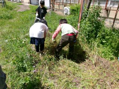 2年生の生活科「ぐんぐんそだておいしいやさい」の学習では,野菜を育てます。そのために、畑の草引きをしました。草がたくさんあった畑は、子どもたちのがんばりのおかげできれいになりました。来週には、野菜の苗を植えていきます。