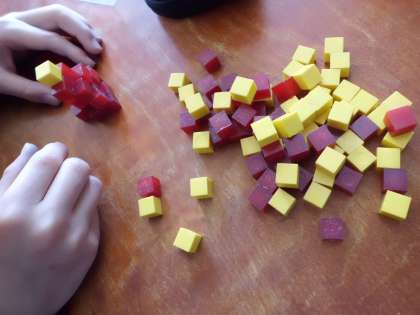 算数の学習では,体積を学習しています。1立方センチメートルのブロックを使って,公式を考えています。そのブロックがとても気に入った様子で,休み時間や空き時間などに積極的にブロックを使っていろんな形を作っています。