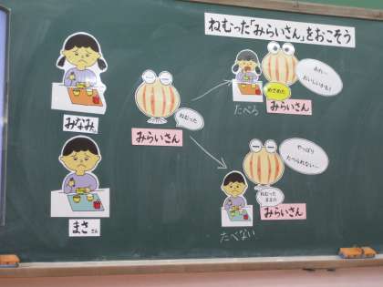 「ねむった みらいさんを おこそう」という学習で、苦手な食べ物もおいしく食べられるように工夫をして食べてみようと子どもたちも、しっかりお話を聞くことができました。