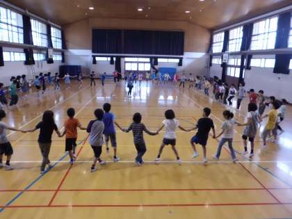 この日は学年全体でマイムマイムとジェンカの練習を体育館でしました。