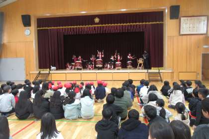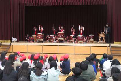 火曜日の中間休みに 和太鼓部の発表がありました。
