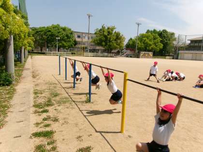 鉄棒を握るときは、親指をぐるりと鉄棒に回して「順手」という持ち方でにぎります。子どもたちは、持ち方に気を付けながら学習に取り組んでいました。