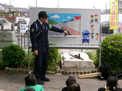 学校では、右京警察署の方による「交通安全教室」が、ありました。子どもたちは、安全な歩き方を聞くだけでなく、実際に学校の前の横断歩道を渡る練習もしました。