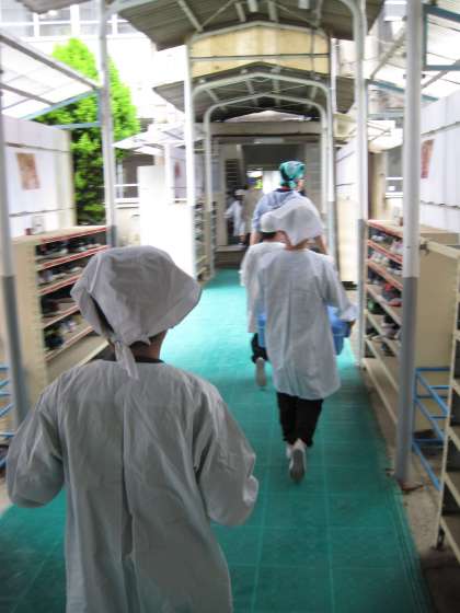 教室に給食を運ぶ時には、持っているものを落とさないように気を付けて、右側通行で歩くようにしています。