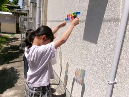 卵パックやペットボトルなど、光を通す透明の材料に色を付けてから、中庭で光を通す活動を行いました。