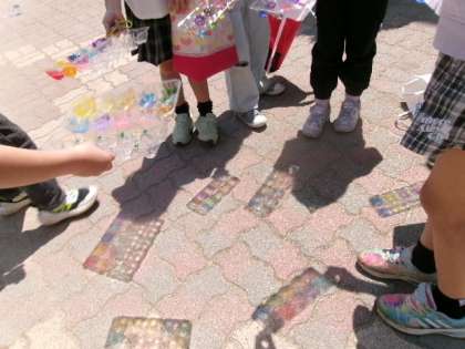 「きれいな色になっている!」「友達とくっつけて太陽の光を当てると一つの絵のようになってるよ。」と素敵な発見をしていた子どもたち。ニコニコ笑顔で活動を楽しんでいました。