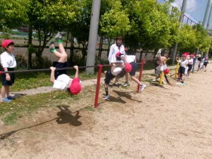 友達とペアになって「鉄棒を握るときは親指を下にして!」「こんなふうに勢いをつけるとやりやすいよ。」「すごい!!できたね。」とアドバイスをしたり、あたたかい声をかけたりし合っている姿も見られました。