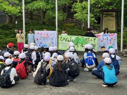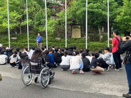 朝の集いは伏見板橋小学校と合同です。お互いの学校紹介を聞きました。