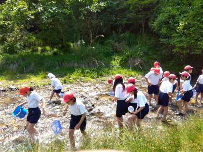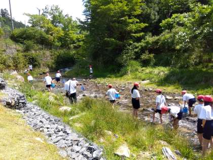 小さな魚やカワニナなど、水辺の生き物と出会いながら、川遊びを楽しんでいます。