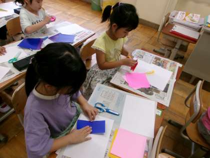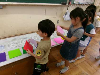 図画工作の「ちょきちょきかざり」の学習を生かして、折り紙で作った形を紙に貼り、カレンダーにしました。