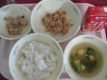給食では、色紙切りにしたこんにゃくを油でいため、だし汁・さとう・みりん・しょうゆで味付けし、最後に花かつおを加えて作りました。