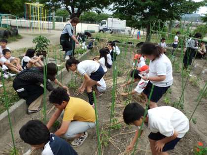 最後に,乾燥を防ぐため,また苗が病気になるのを防ぐために,わらをかぶせました。そのあとたっぷりお水をあげました。これから収穫まで,みんなで協力して野菜を育てていってほしいと思います。