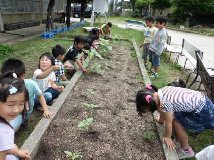 ひまわりが元気に芽を出し始めました。目で見て、触れて成長を実感しました。