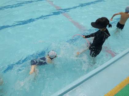 1年ぶりのプールにみんな興奮気味でしたが,安全に学習するためのルールをしっかり聞き,楽しく水慣れをすることができました。