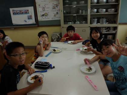 みんなで「いただきま〜す!」。醤油とかつおぶしをかけて,ワイワイ楽しく食べました。自分で調理したほうれん草のおひたしは格別だったと思います。