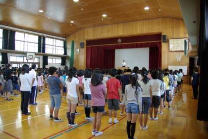 終業式では校長先生のお話を聞き,宿泊行事,運動会などたくさんの行事があり楽しくがんばった前期を振返りました。そして,あらためて自分たちが成長したことを感じることができました。また,友達の大切さやきまりを守ることの大切さについてもお話を聞き前期のまとめにしました。