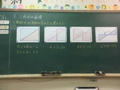 算数で学習している面積。直角三角形の面積の求め方を考えました。長方形の半分だから「÷2」という考えがほとんどでしたが,ある子どもが回転方式を発表すると,「あぁ!!」「なるほど!」「うわ!ほんまや!」という驚きの声がたくさんあがり,最後は自然と拍手がおこりました。そうして算数のおもしろさを感じたり,考える引き出しを増やしたりしてほしいと思います。