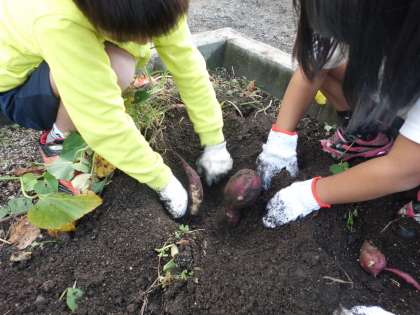 サツマイモを見つけるたびに歓声を上げながら一生懸命掘りました。