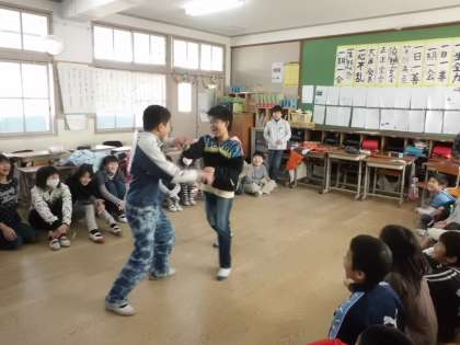 次に教科のカードを使ってすもう大会!それぞれの背中に教科のカードを貼って,相手のカードを見て答えるゲームです。みんなすばやく動きながら「はい!English!」などと言って,英語の表現に親しんでしました。
