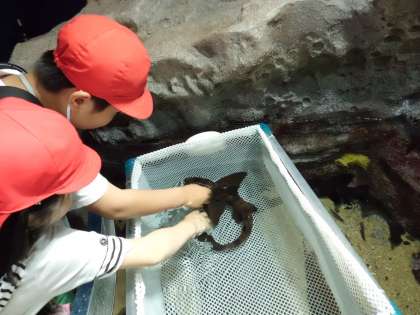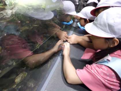 水辺の生き物をたくさん観察しました。ネコザメを触ったり、イルカショーを見たりと京都水族館を堪能しました。
