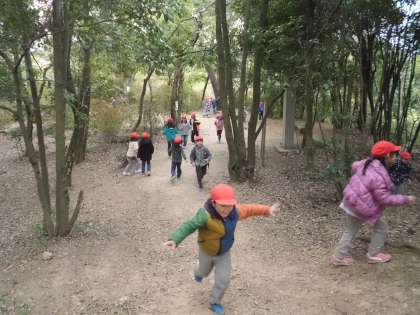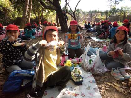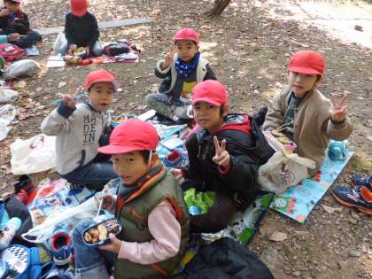 秋をたくさん見付けたので11時過ぎから「お腹すいた〜。」の声がしました。お家の人が朝早くから一生懸命作ってくれたお弁当をとても嬉しそうに食べた子どもたち。お弁当を食べた後は、「いちのおか」の頂上まで登ることにしました。頂上からは京都市内が一望でき、子どもたちは驚いていました。広場や斜面で思いっきり遊び、嵐電に乗って学校まで帰ってきました。