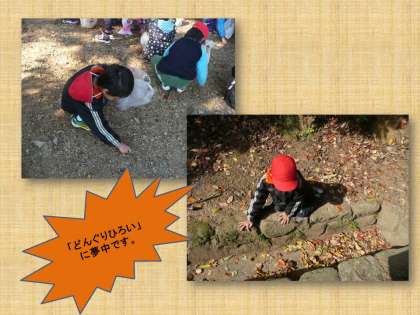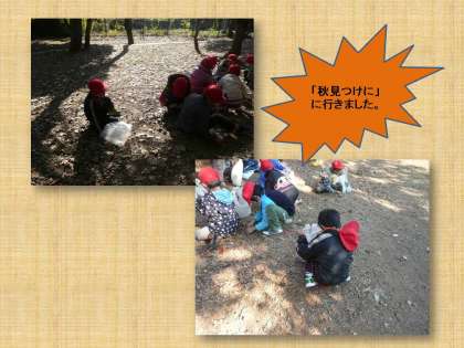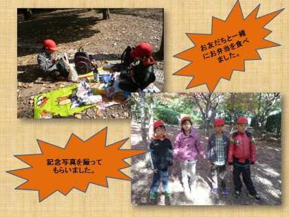 お友だちと「どんぐりひろい」をしたり 一緒にお弁当を食べたりしました。