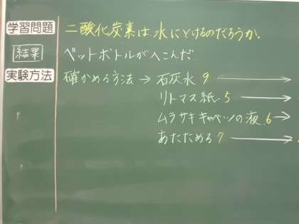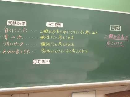 水溶液の学習が終わり,「危険な薬品を使って初めは怖かったけれど,おもしろい実験がたくさんあって心に残った」「金属をとかすなんて思いもしなかった」「ムラサキキャベツ液の実験は色がきれいで楽しかった」など,ふり返りました。危険な薬品を使う実験の中,きちんとルールを守って学習活動に向かう姿は大変すばらしかったです。