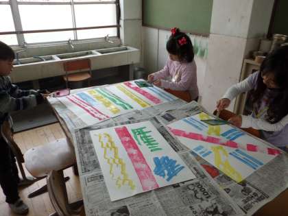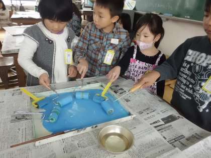 図画工作科で「いろいろペッタン」の学習をしました。ローラーやブラシを使って絵をかきました。子どもたちはとても喜びながら、ローラーを動かしたり、ブラシを使ったりしていました。来週木曜日に、この絵の上にスタンプを押します。