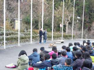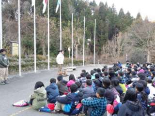 さて,子どもたちはと言うと,元気に朝を迎えています。同じ日程で宿泊している他の3校と合同で朝のつどいを行いました。代表児童は,立派に学校紹介をしました。