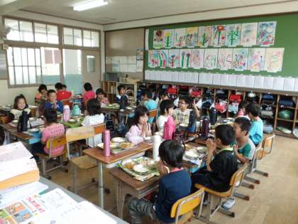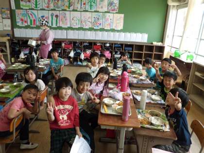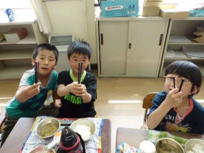 5月1日・2日,6年生が修学旅行にいっている間,2年生の交流学級に給食を食べに行きました。お友だちといっしょに食べた給食はとっても美味しかったです。みんなとたくさんお話しができ,とても楽しかったようです。