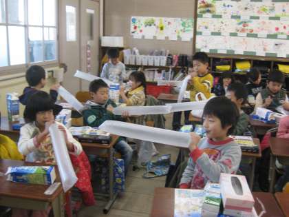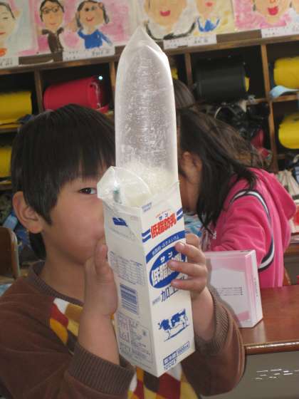 図画工作の時間に,「ムクムクニョキニョキ」という,息を吹き込むと飛び出す仕組みのおもちゃをつくっています。