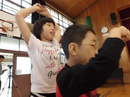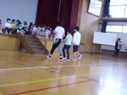 5月9日に1年生の『お迎え集会』がありました。6年生は1年生と手をつないで舞台まで案内します。とっても緊張した様ですが,1年生のペースに合わせてお姉さんらしく歩いていました。そしてそのあとは,みんなで○×ゲームもしました。