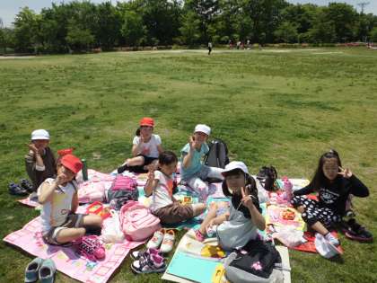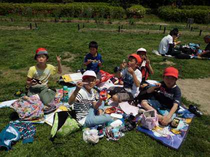 京都タワーの次は梅小路公園へ行きました。線路沿いの電車を見ながら公園まで歩きました。芝生にシートを敷いてお弁当を食べました。たくさん歩いたのでおいしくいただきました。お弁当の後は,お楽しみのおやつも食べました。