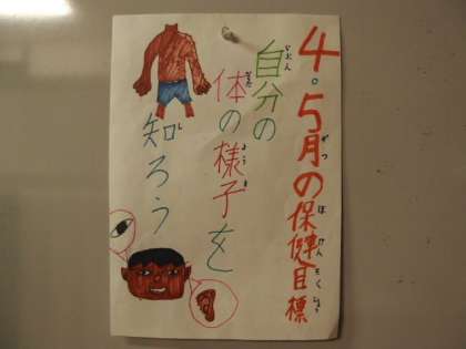 みなうずタイムで,委員会の紹介をしました。5月の保健目標は,「自分の体の様子を知ろう」です。毎日,元気に勉強したり,遊んだりするためには,健康が大切です。4月〜6月にかけて,健康診断をして,体の成長をはかったり,具合の悪いところがないか,病気にかかっていないかなどを調べたりします。学校の健康診断は,スクリーニング(病気の疑いのある人を見つけ出すもの)です。お知らせプリントをもらった人は,専門医で診てもらうようにしましょう。