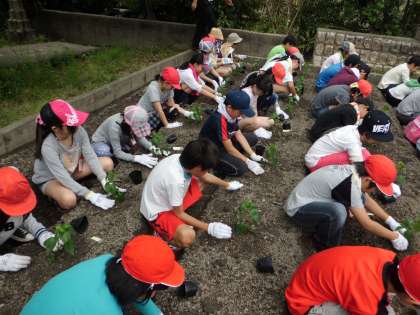 JA宮崎経済連から指導者をお招きし,京都青果合同株式会社からもご支援いただいて,ピーマンの苗の植え付け作業を行いました。この苗は,実際に宮崎県の農家の皆様が育てておられる品種で,上手に栽培すれば1つの苗から30〜40個の元気なピーマンが収穫できるそうです。一人一本の苗を自分の手で植え,これから自分でしっかり世話をして育てていきます。