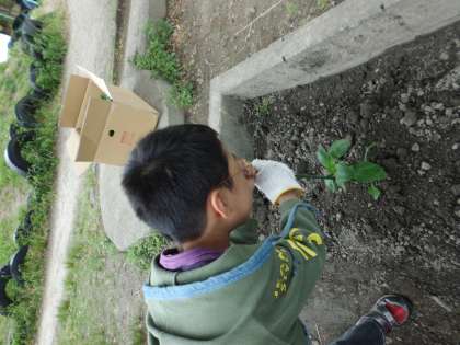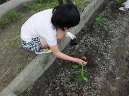 教頭先生に教えていただきながら,ピーマンの苗を植えました。教頭先生が「お世話をしっかりすると,このピーマンの苗1つから30個とれるかもしれません。」と教えていただきました。すると子どもたちは「僕は100個出来るようにお世話頑張ります。」「私は50個できるようにお世話頑張ります」とピーマンができるのを楽しみにしています。