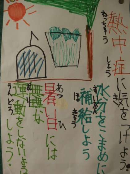 保健委員会から熱中症の予防について,放送でお知らせをしました。熱中症は,暑い時に体温調節がうまくできなくなって起こることがあります。頭痛,気分が悪い,吐き気などの症状がでることがあり,救急車で病院に行くこともあるので気をつけましょう。