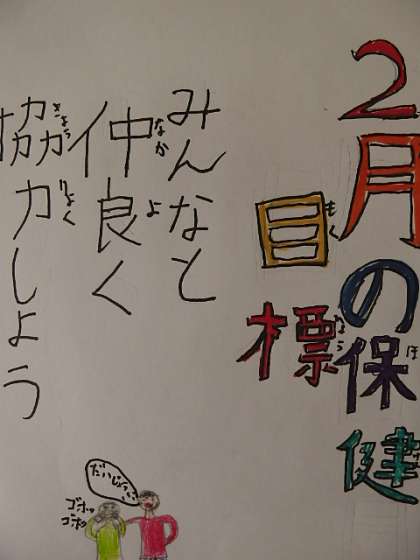 2月の保健目標は「みんなと仲良く協力しよう」です。保健委員会でポスターを作り,掲示しています。友だちに何かしてもらった時「ありがとう」と言っていますか?意外と言えていないことが多いのではないでしょうか。「てれくさい」「じゃまくさい」なんて思わないで,ちゃんと「ありがとう」と言えるといいですね。「ありがとう」は人のために言うのではなく,あなたの感謝のこころを相手に伝える,自分のためでもあるのです。友だちを大切に,みんなと仲良く協力して,楽しく学校生活が送れるといいですね。