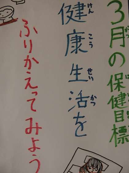 3月の保健目標は「健康生活をふりかえってみよう」です。みなうずタイムで、保健委員会から発表しました。今年度をふりかえると、4月からの新しい生活への予防につながるのではないでしょうか?何かしらの病気やけがをしてしまった人は、4月から健康にすごすために見直すことが大事です。いま、調子のよくないところがあれば、春休みのうちに受診するなど考えてみましょう。それぞれの新しい場所で、はじめの一歩を元気にふみ出したいですね。