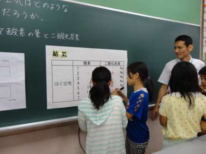 第1回目の校内研究授業は6年生の理科で「吸う空気とはく空気ではどのようなちがいがあるのだろうか?」という学習問題を気体検知管という酸素と二酸化炭素の量が測れる実験器具を使って確かめました。