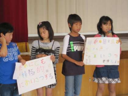 おはようの取り組みの発表がありました。1組も2組もクラスみんなで考えた目当てを代表委員の子が発表しました。あいさつはとっても大事なので絶対にがんばっていきましょう。児童会は司会進行をしました。