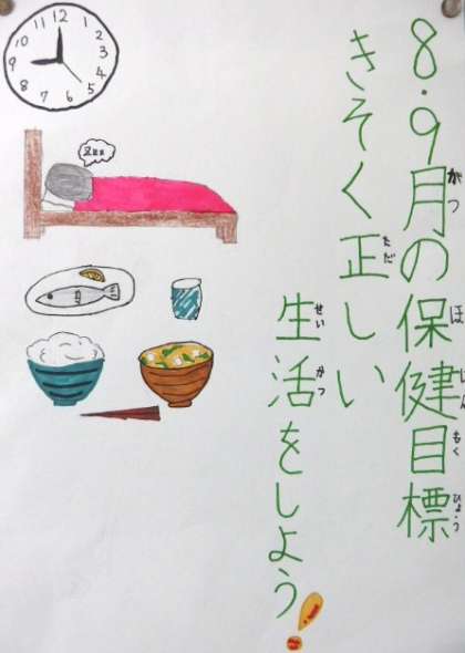9月の保健目標は「きそく正しい生活をしよう」です。児童保健委員会から,保健目標について,朝会で発表をしました。「早寝早起きをしましょう」とよく言われますが,「どうして?」と思っている人もいるかもしれませんね。早い時間に寝て,しっかり睡眠をとることで,疲れをとったり体の成長を進めたりする「成長ホルモン」が出ます。そして,早起きをして太陽の光をあびることで,体内時計と呼ばれる体の中のリズムが整い,目覚めよく,一日元気にすごせるようにしています。また,早起きをして元気に活動すると,夜も早く眠ることができるようになり,翌日の早起きにもつながります。「早寝早起き」が習慣になるといいですね。
