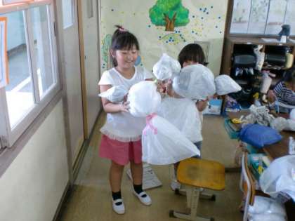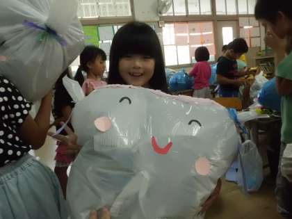 図画工作科の学習の時間に袋を使った工作をしました。袋に新聞紙を入れて,モールやひもで縛り,耳,顔,体を作ります。色や飾りをどうするか考えながら,素敵な作品を作り上げていました。