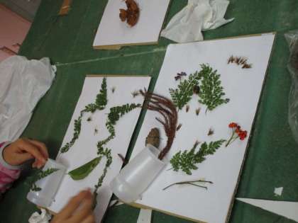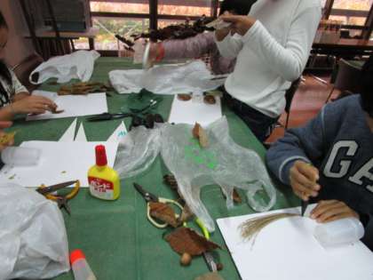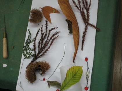 山の家の記念に,おうちの方への花のプレゼントを作りました。池坊の皆様のお世話になり,生け花を作成しました。まずは,自分たちが集めた落ち葉や木の実などでプレートを飾りました。